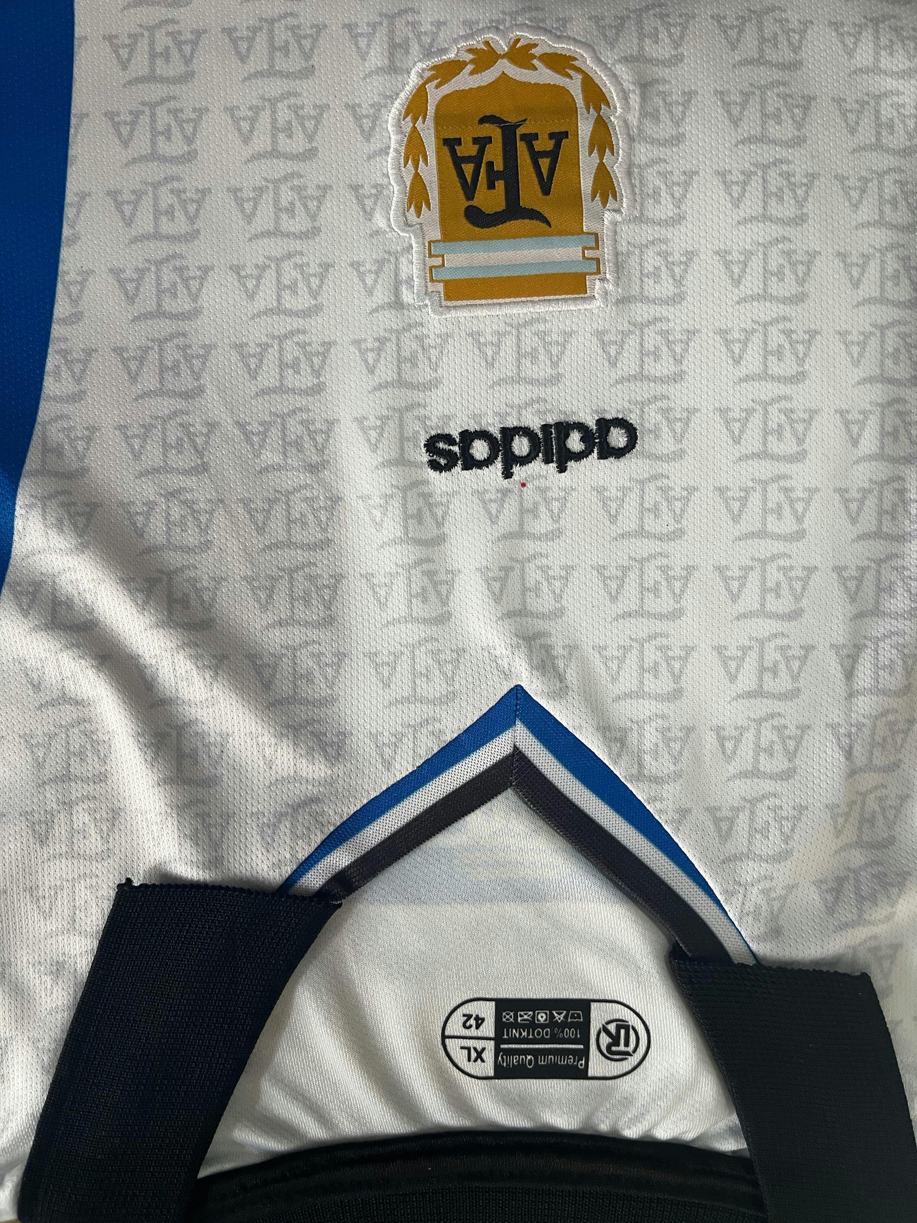 Designed in the classic white base with striking blue and black geometric sleeve patterns, this jersey features a traditional collared neckline, giving it an authentic retro feel. The embroidered Argentina crest adds depth and luxury, while the all-over textured detailing enhances its premium look.